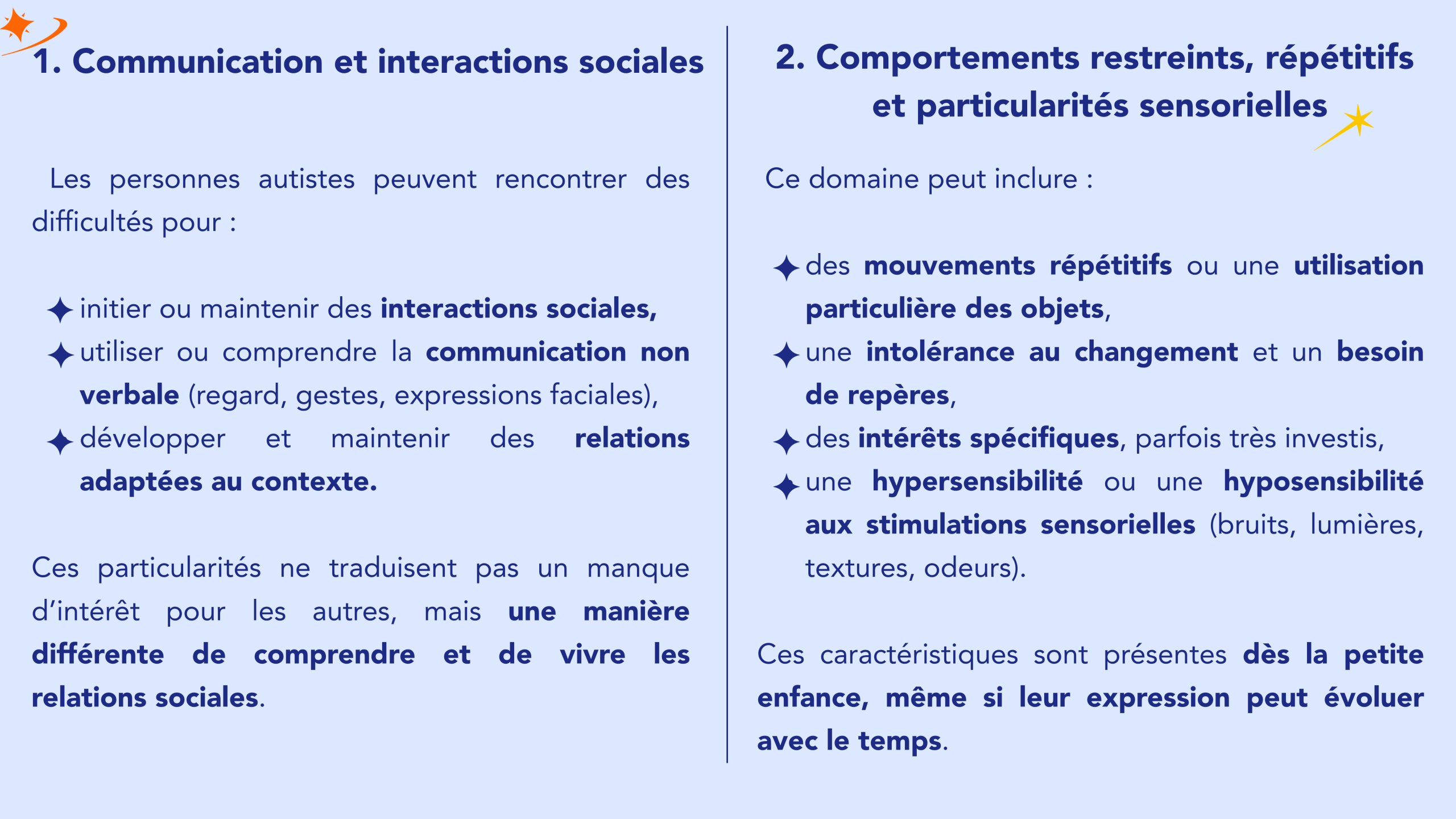 Les classifications internationales actuelles, notamment le DSM-5*, décrivent des caractéristiques communes permettant de définir le trouble du spectre de l’autisme. Elles s’organisent autour de deux grands domaines diagnostiques :